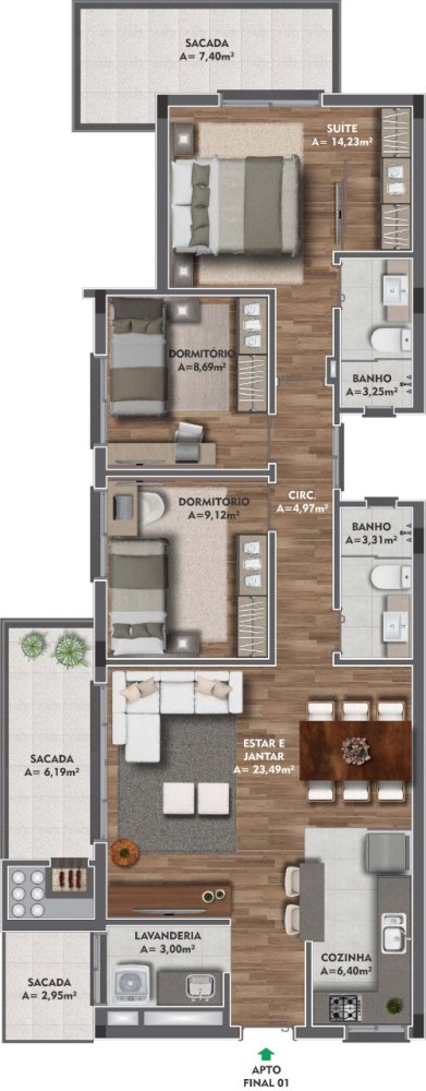 03 Dormitórios (1 suíte com sacada)